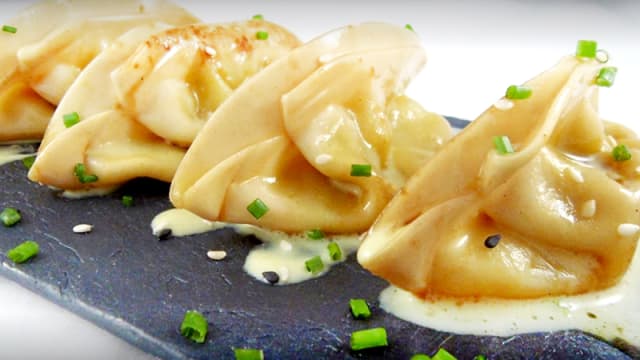 relleno de carrillera de ternera a baja temperatura, verduras, cilantro y Yakiniku