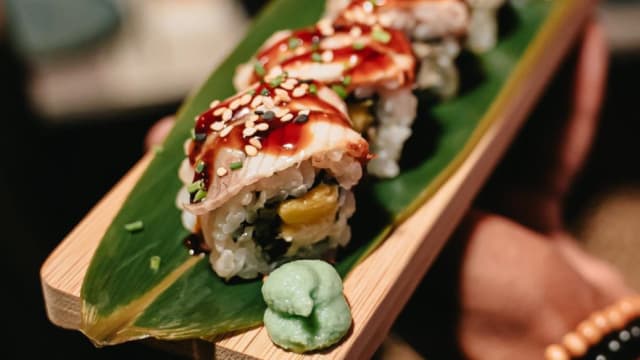 Langostino crujiente y aguacate, cubierto de salmón caramelizado, cebolla crispy y salsa genso