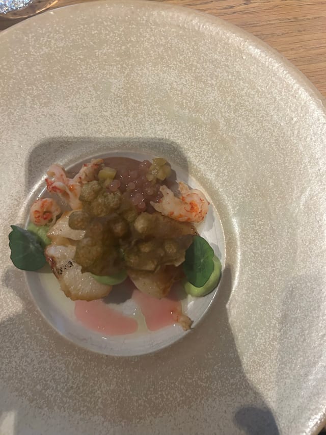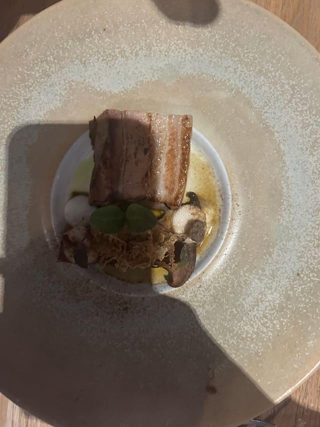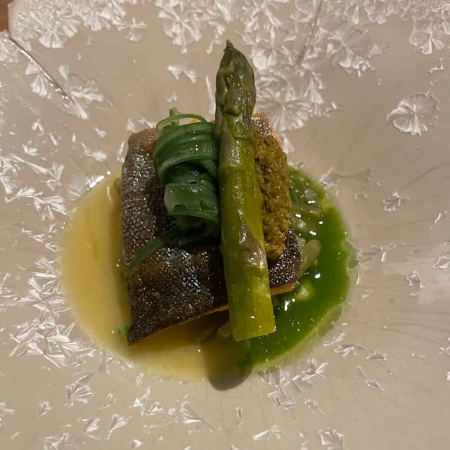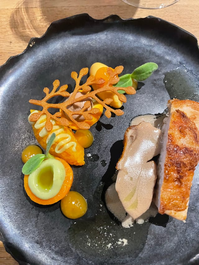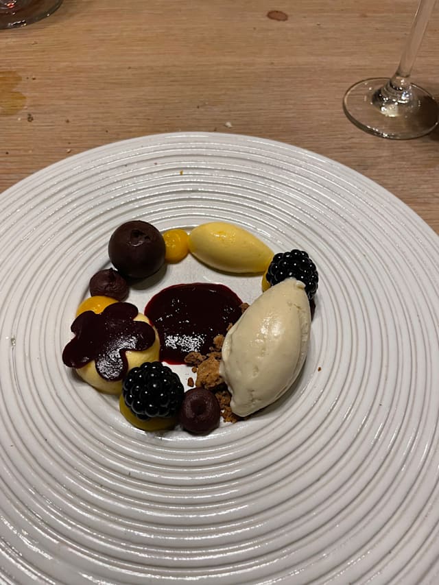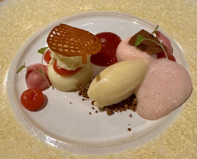 Gepocheerde peer | mousse van earl grey | pistache praliné | sorbet van long pepper