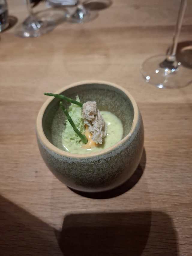 - Krokante kalfszwezerik | bleekselderij compôte | paddenstoelen | groene asperge espuma