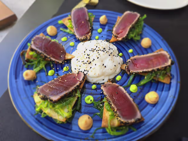 - (Alficoz, encurtidos, tomate confitado, tataki de atún, cebolleta asada)