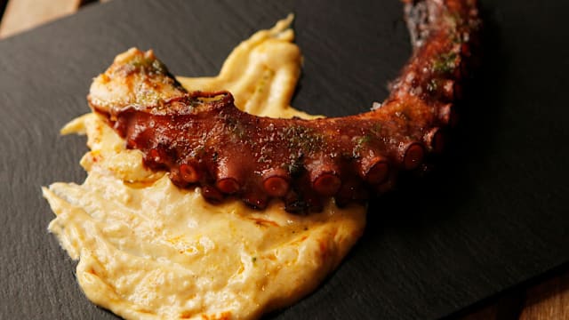 Pulpo tierno, servido sobre un suave puré de patatas cremoso, con un toque de pimentón y aceite de oliva virgen extra. Un plato que combina la delicadeza del mar con la suavidad de la tierra.