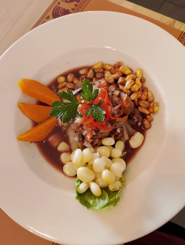 Tamal de cerdo (o pollo), yuquitas con huancaína, arroz con pato