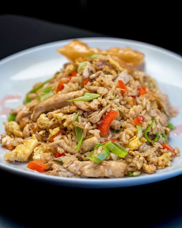 Arroz frito con pollo, huevo , cebolla chiná, aromatizado con salsa de ostion, soja y canela china