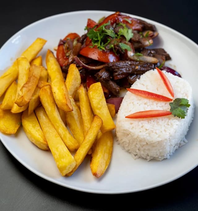 Tiras de lomo fino de res, flambeados y salteados con soja, cebolla, tomate y papas fritas, acompañado de arroz blanco