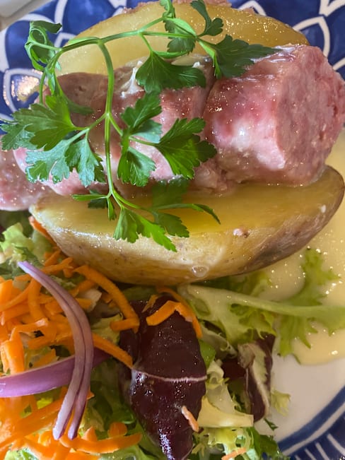 7/10It’s a beautiful atmospheric restaurant and staff are pleasant but got my husband’s main course wrong, however it was good. Unfortunately my main course of turkey was tough & lacked flavour, it was served with pasta which also lacked flavour. The turkey was smothered in a flavourless mushroom sauce. The herring starter was lovely and the covert. We had a lovely red wine. We were disappointed but we may consider a second visit in the Autumn.