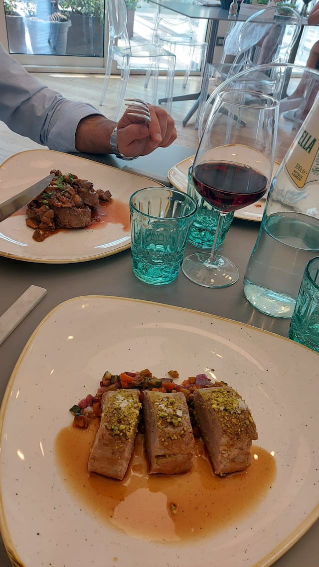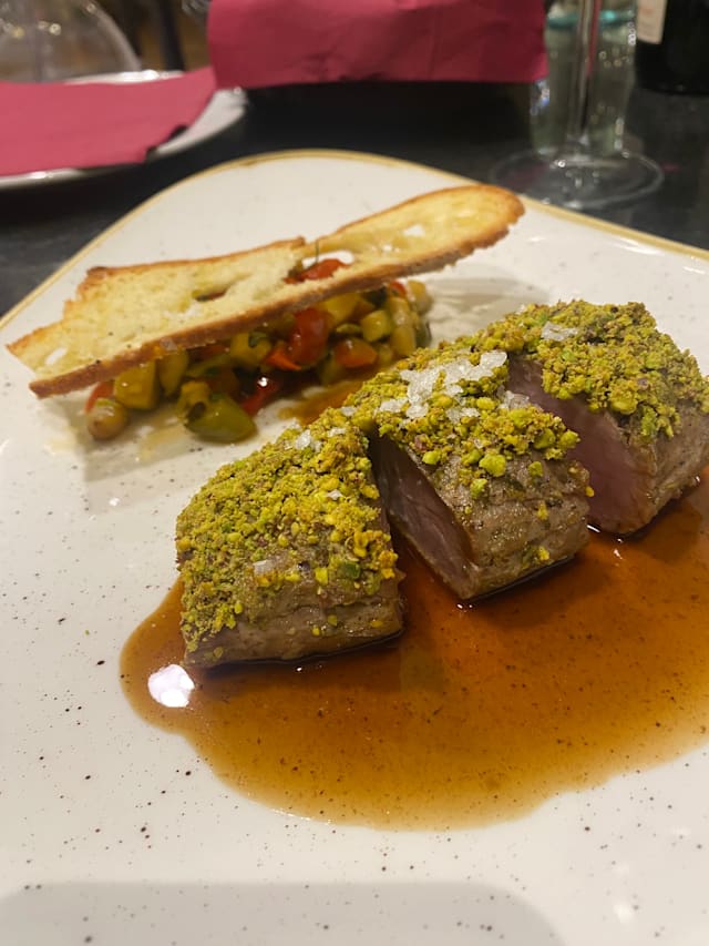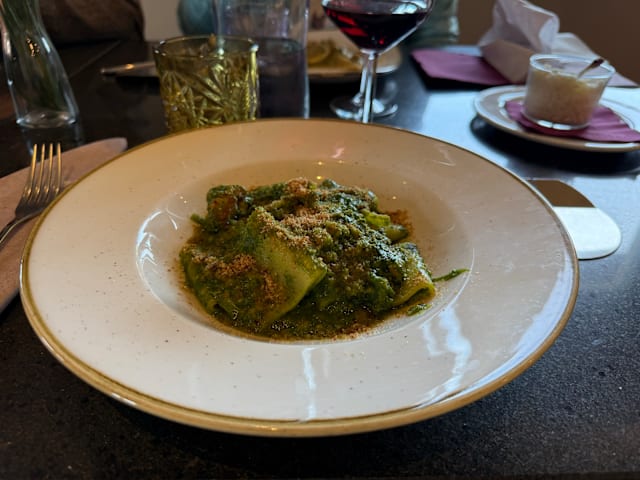 Quadrucci ripieni di Ricotta e Spinaci con Pistacchio e Guanciale croccante