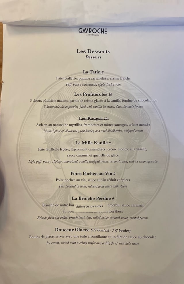 10/10We walked right in for our reservation and loved it from the moment we waked in. It was a great way to end our night! We bought a bottle of wine. The 4 of us had an entree and dessert each as well as the onion soup; which was amazing! So many great options to choose from!