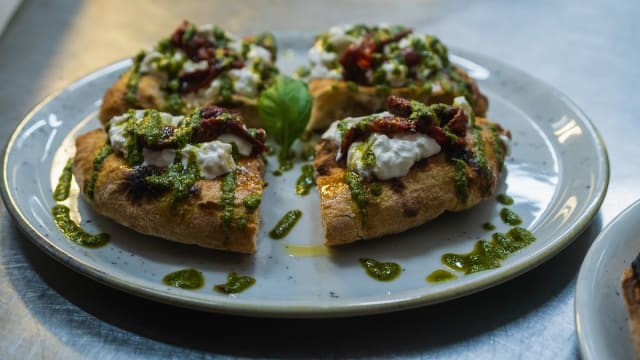 Pizzette Fritte con crema burrata, salsa rucola e pomodorini semi-dry