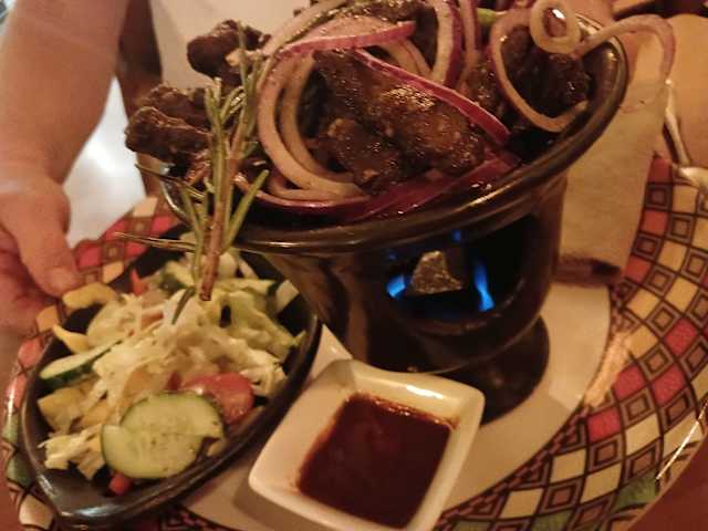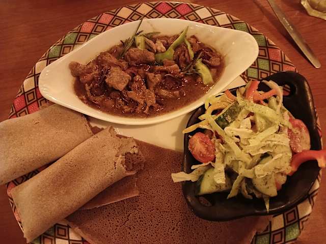 E malse medium-rare runderblokjes gekruid met nitir kibe (gekruide boter) en awaze, geserveerd met injera en een salade erbij