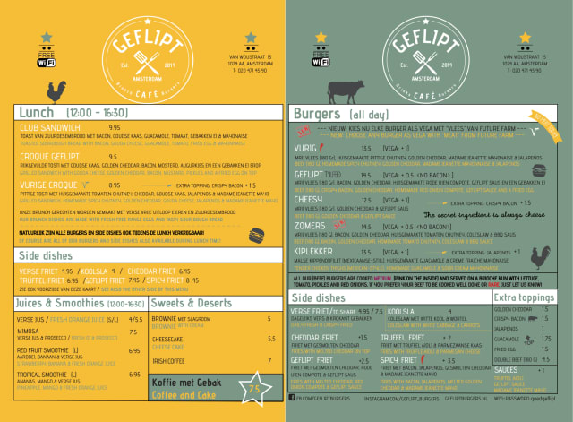 Geflipt is een gezellig en écht Amsterdams eetcafé, gespecialiseerd in de beste burgers. Bij Geflipt eet je daarom de lekkerste hamburgers en geniet je van een heerlijk (speciaal)biertje, cocktail of wijntje in lekker ongedwongen sfeer.