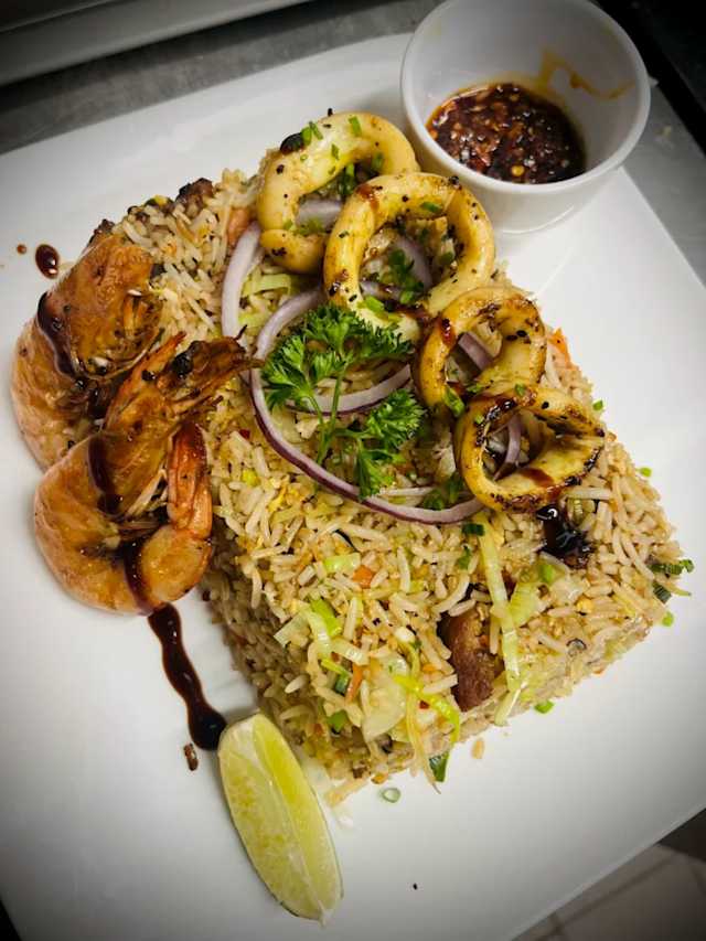 - Calamari, onion, poivron-cubanelle' vert, soy sauce, épices Sri Lankaises