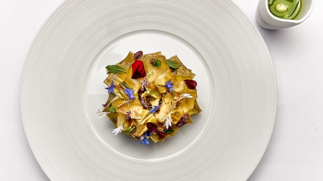 Sogliola al burro, crema di chinotto di savona, estratto di salvia e lattuga