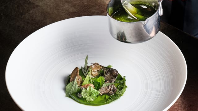 Lumache trifolate con crema dierbe spontanee, gel di eucalipto, estratto di acetosella e semi di prezzemolo