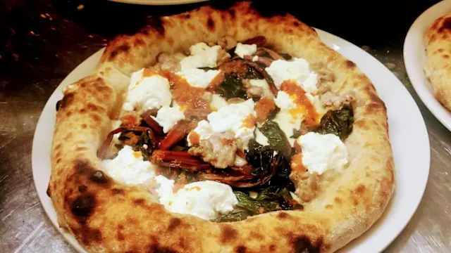 - Salsa di pomodoro, mozzarella ordilatte locale, salsiccia secca piccante, pecorino pepato, crema di peperoncino, olio extravergine di oliva