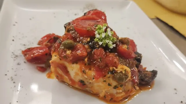 - Costoletta di pesce spada grigliata con contorno di caponata