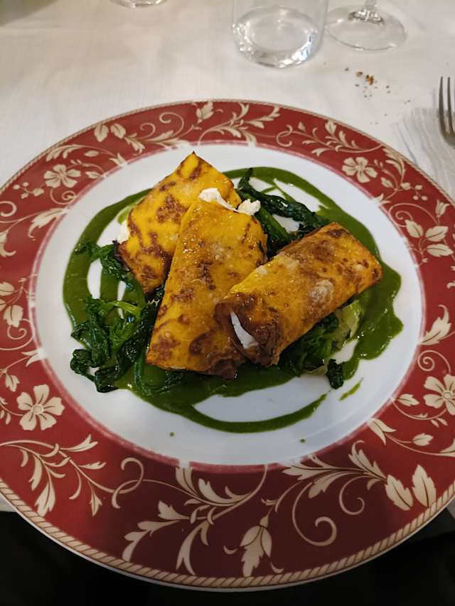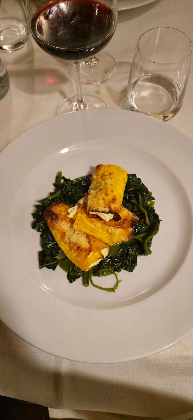 Crespelle allo zafferano con ricotte miste ed erbe, spinaci saltati e limone