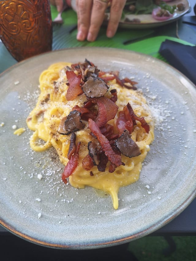 Raviolo ripieno di carbonara con uovo cotto a 62° e scaglie di tartufo