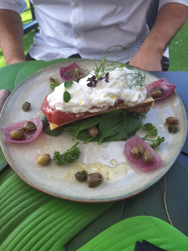 Tartare in stinco con stracciatella di bufala, capperi, cipolle rosse agrodolci e spinacino