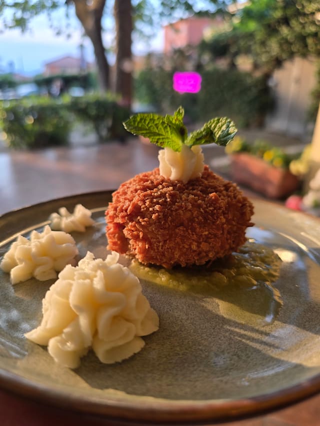 - Bocconcino di trippa croccante con crema di pecorino e salsa di sedano