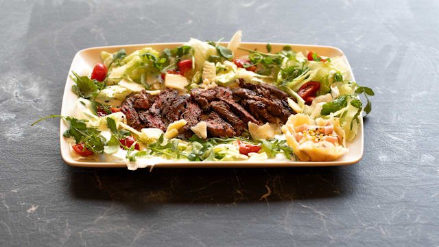 Condita con melanzane e salame, zucchine, mortadella, mozzarella di bufala, caprese, prosciutto crudo, lonza e patatine centrali