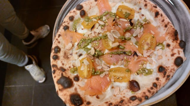- Mozzarella, salmone, datterino giallo, granella di mnadorle e pistacchio