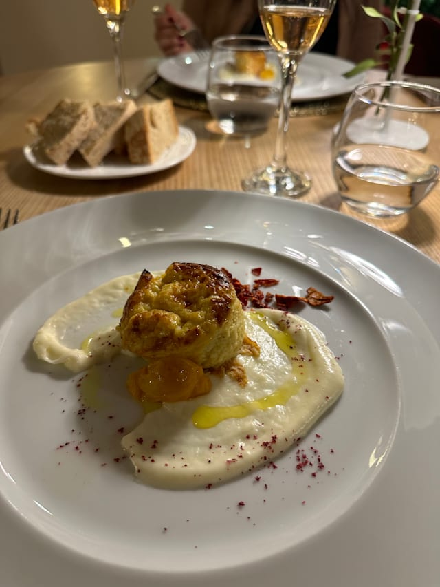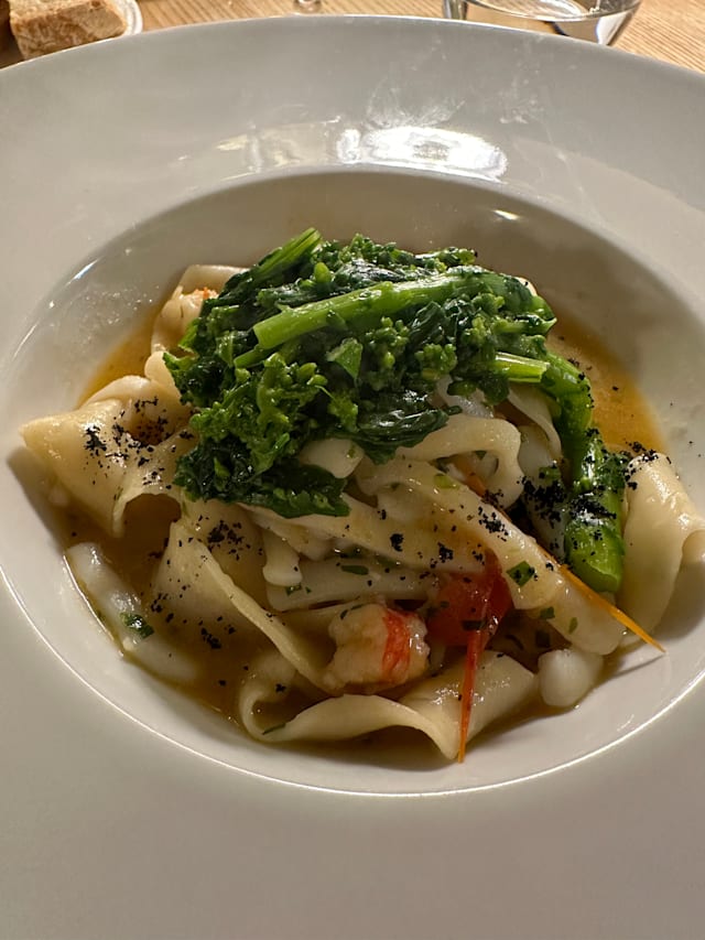 Rettangolo di pasta fresca con Nduja e cozze, pomodoro al forno, pecorino liquido
