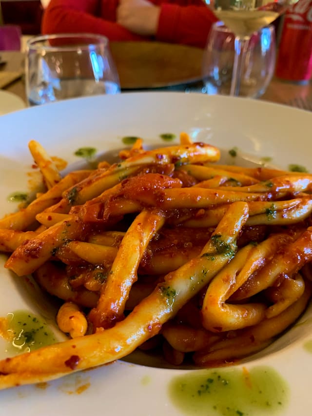 Fileja fatti a mano, Nduja di Spilinga, pomodoro confit, cipolla rossa di Tropea