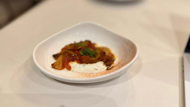 - Aubergines préparées avec une sauce de tomates fraîches mijotées doucement, servies avec du yaourt et garnies de coriandre.