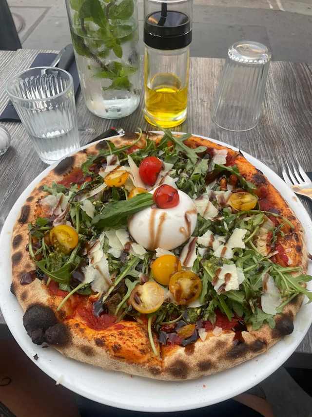 - Sauce tomate maison, tomates cerises, burrata, basilic, roquette, pesto
