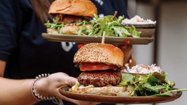 - Bœuf, cheddar, bacon caramélisé, mayo piquante, laitue, oignon rouge