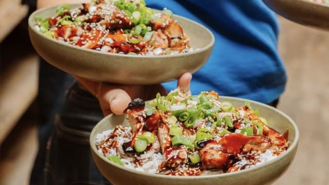 - Porc mariné & fumé, riz, légumes de saison, sauce BBQ.