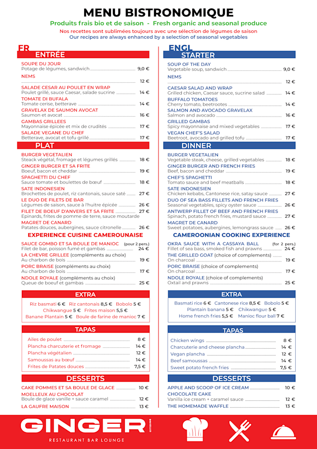 Cuisine du monde ouverte jusqu’à très tard dans la nuit , techniques françaises, le Ginger est l’endroit idéal pour dîner, boire un verre ou dîner autour d’une bonne assiette. Produits de saison Cocktails signatures, djs et House music L'ambiance est à la fois chaleureuse et moderne, idéale pour un ...