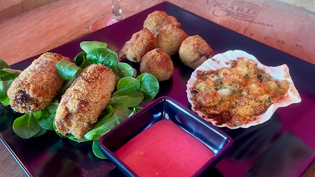 Piatto del giorno con aggiunta di due piatti da menù accompagnati da tre calici di vini Pugliesi