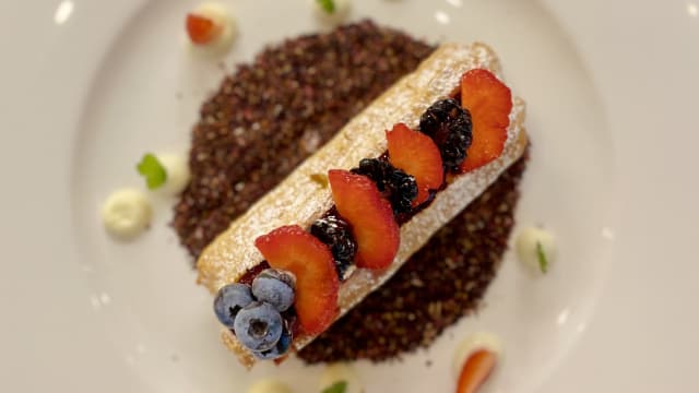 Fried pastry tuile, sponge cake flavoured with Alkermes liquor, vanilla and chocolate custard cream.