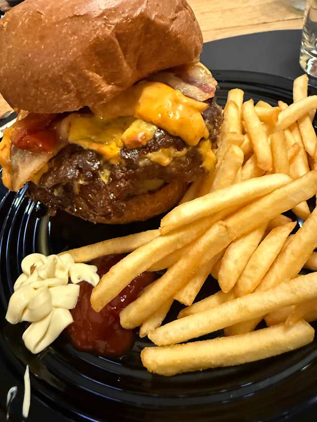 - Bun, burger di scottona, cheddar, bacon croccante, cipolla caramellata, pomodoro cuor di bue, insalata e salsa BBQ (serviti con patatine fritte)