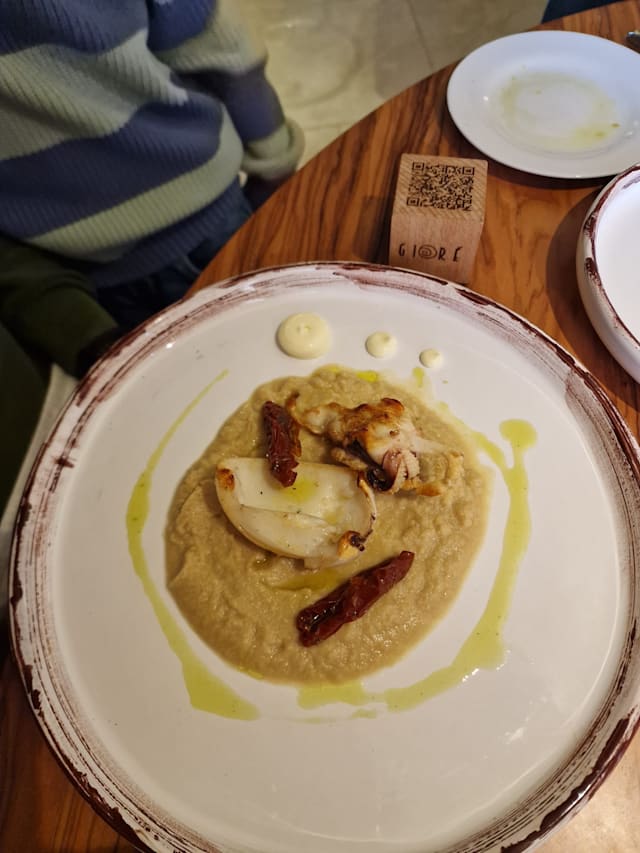 9/10Beautiful star vaulted ceilings, and tastefully decorated restaurant. The atmosphere was warm and welcoming, although the background music was barely audible. The fave was delicious, however, the pieces of 'friselle' which adorned it were like eating tiny stones and I could imagine that someone might brake a tooth on them. The duck was rather small and overcooked which was a shame. But the side order of vegetables were delicious!
