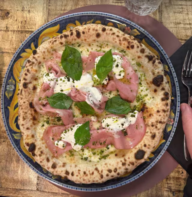 - Mozzarella fiore di latte, stracciatella, jambon artisanal italien, truffes tuber aestivum, noisettes grillées concassées, huile de truffes