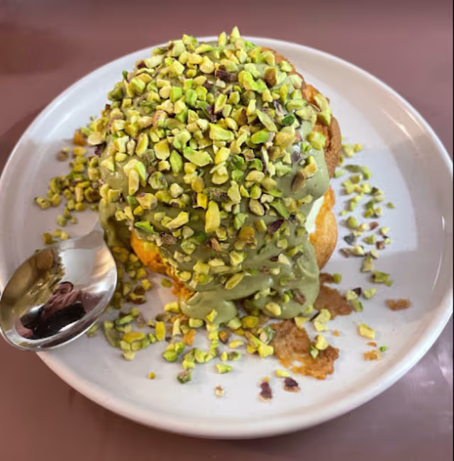 - Profiterole à la glace vanille des frères amoré, praliné de pistache, crème de pistache, éclats de pistache