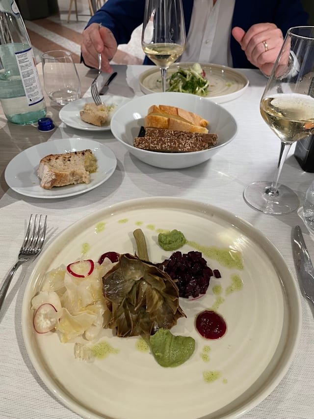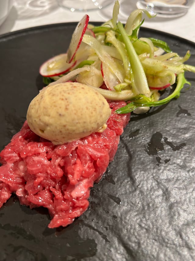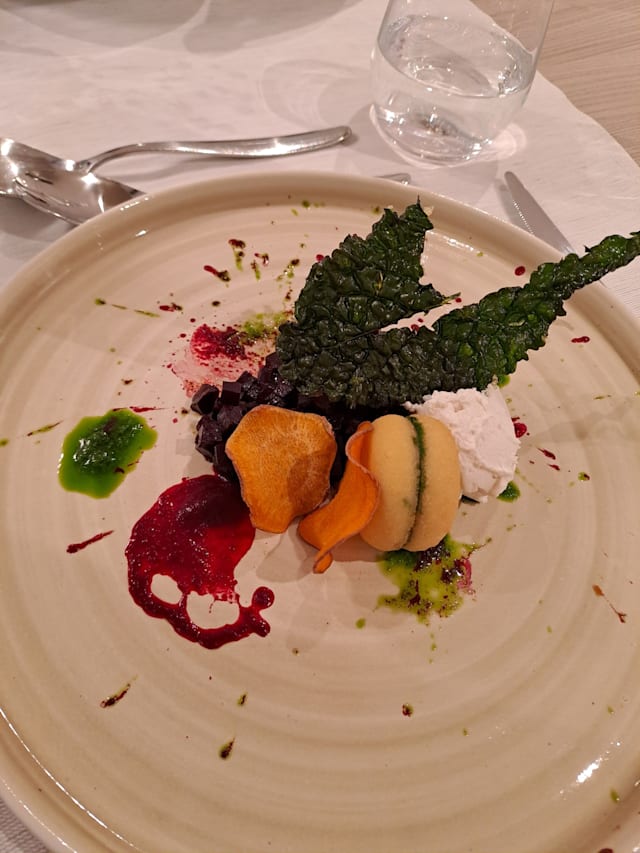 Battuta di scottona alle erbe, bouquet di verdure di stagione e sorbetto alla mela verde