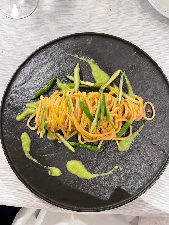 Umbricelli al germe di grano e legumi in crema d’uovo, zucchine e fiori di zucca