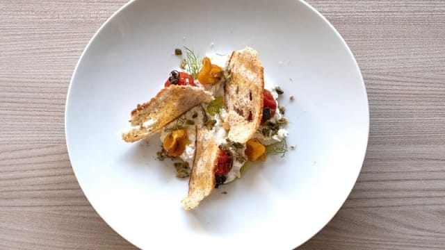 Baccalà arrostito, caponata di peperoni, cipollotto, prugne e pinoli