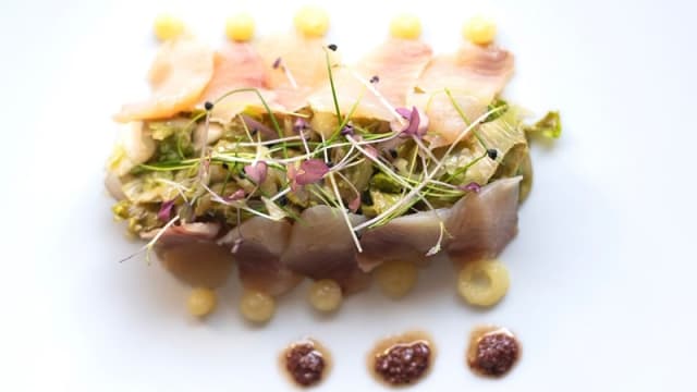 Crudo di trota della valnerina, le sue uova, lenticchie della piana di gubbio e topinambur