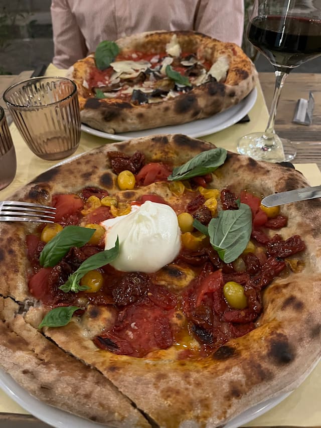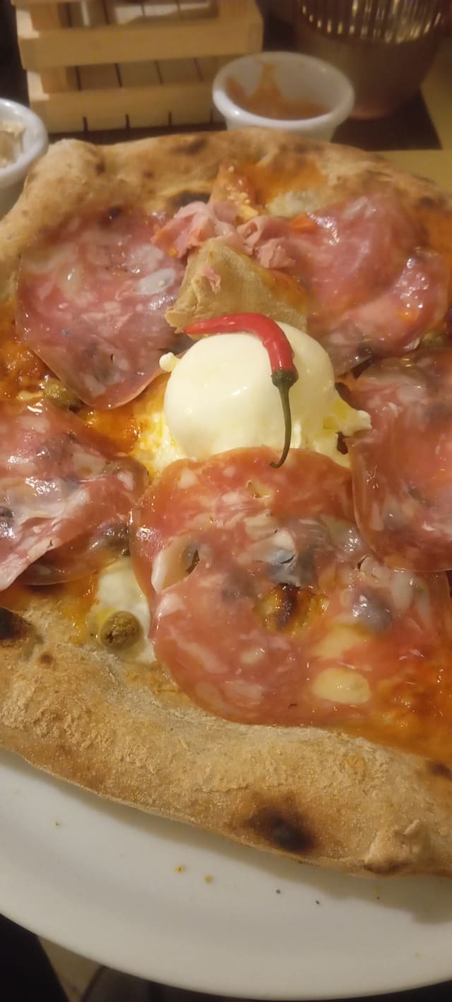 Salsa di pomodoro, filetti di acciughe del cantabrico, datterino giallo in succo, stracciatella di bufala, basilico.