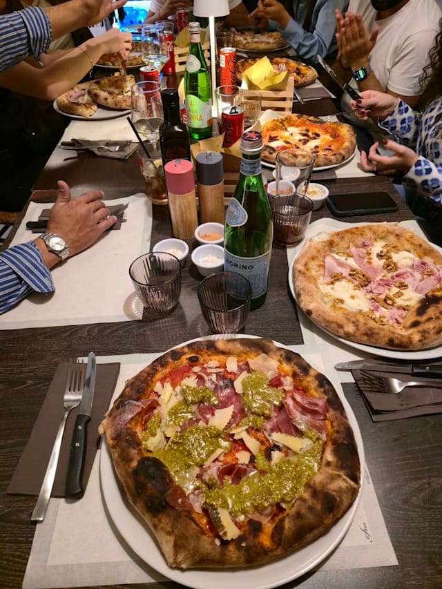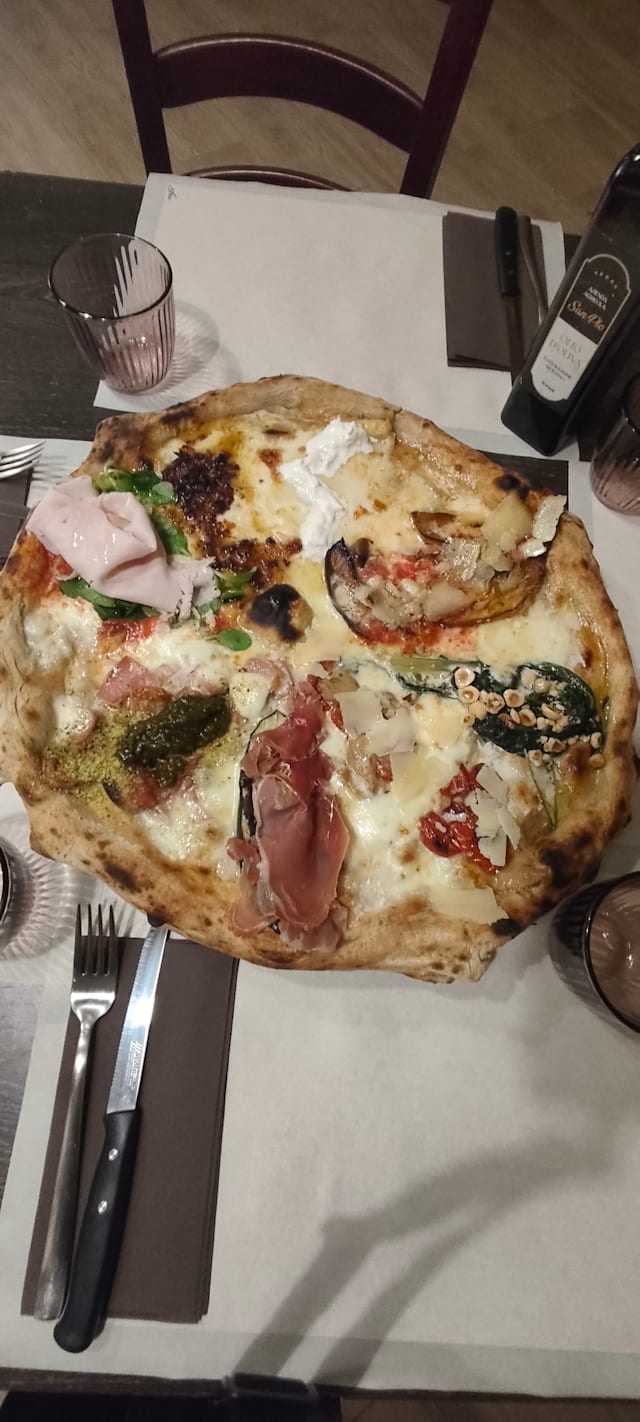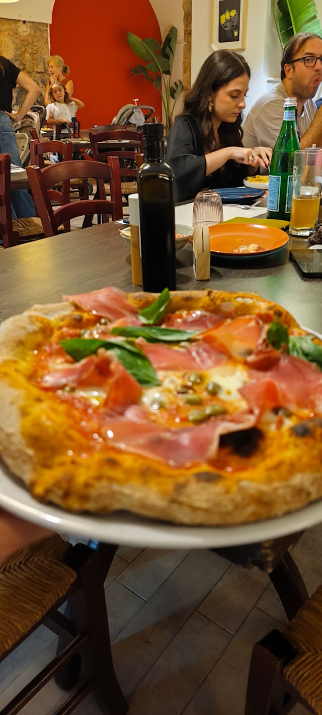 Salsa di pomodoro, crudo di parma addobbo 24 mesi, scaglie di nero di sicilia, crema di pistacchio, olio di nocellara, basilico.