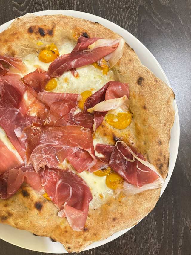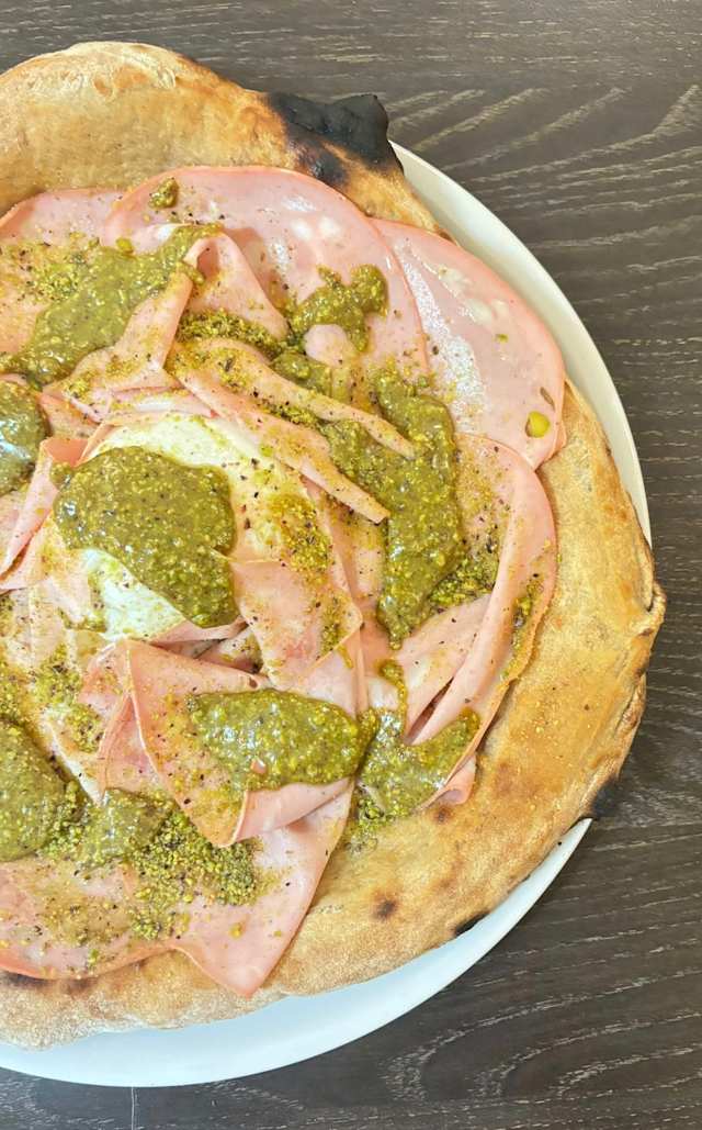 - Salsa di pomodoro, crudo di parma addobbo 24 mesi, scaglie di nero di sicilia, crema di pistacchio, olio di nocellara, basilico.