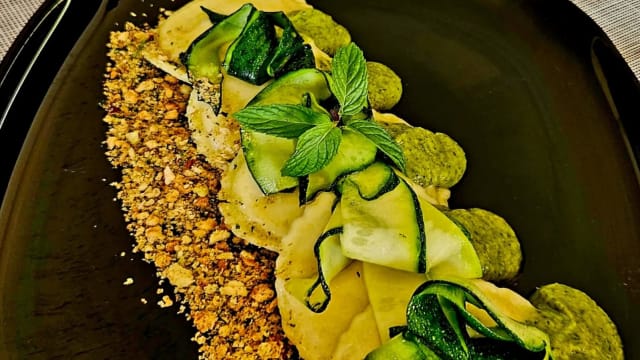 Zucchine a filo mozzarella fiordilatte pecorino romano DOP parmigiano reggiano DOP crema di provolone crema di zucchine panatura croccante (erbe aromatiche aglio frutta secca) olio evo colli salernitani menta fresca basilico