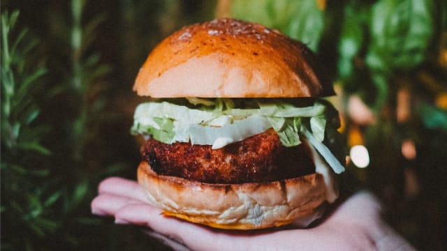 Puccia croccante, burger di barbabietola e fagioli, gentilina, pomodoro grappolo e maionese vegana