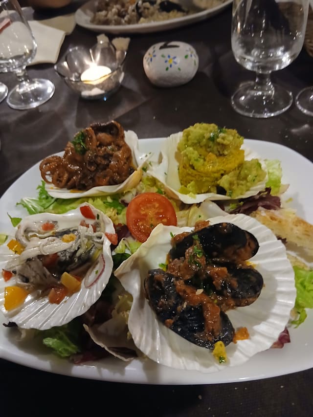 Quttro assaggi di specialita' di mare serviti in Saint Jacques