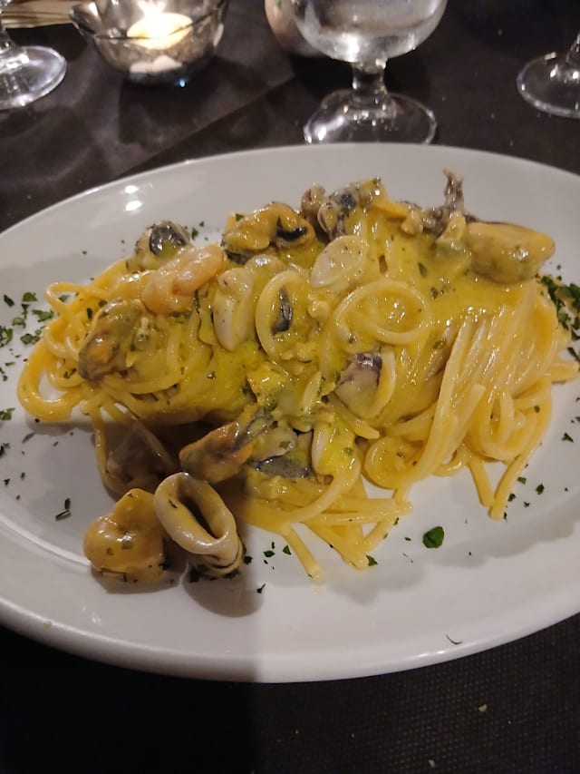 Spaghetti con cozze, vongole, crostacei mantecati con uovo